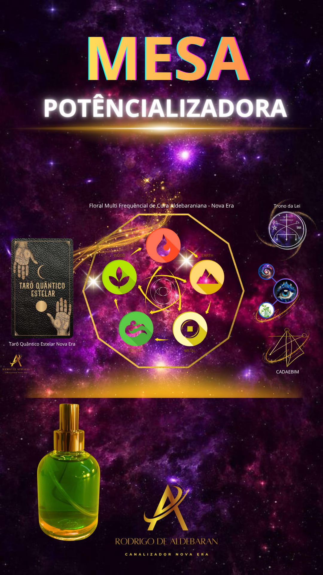 A mesa cria um campo eletromagnético sagrado que conecta os planos físico e espiritual, permitindo que os florais multifrequenciais, as sementes de 2026, o bastão multifrequencial, o tarô quântico estelar e o pêndulo egípcio de madeira sejam banhados por ondas sutis de luz universal. Cada um desses instrumentos passa a vibrar em uma frequência superior, tornando-se um portal de prosperidade, cura, amor e realização.